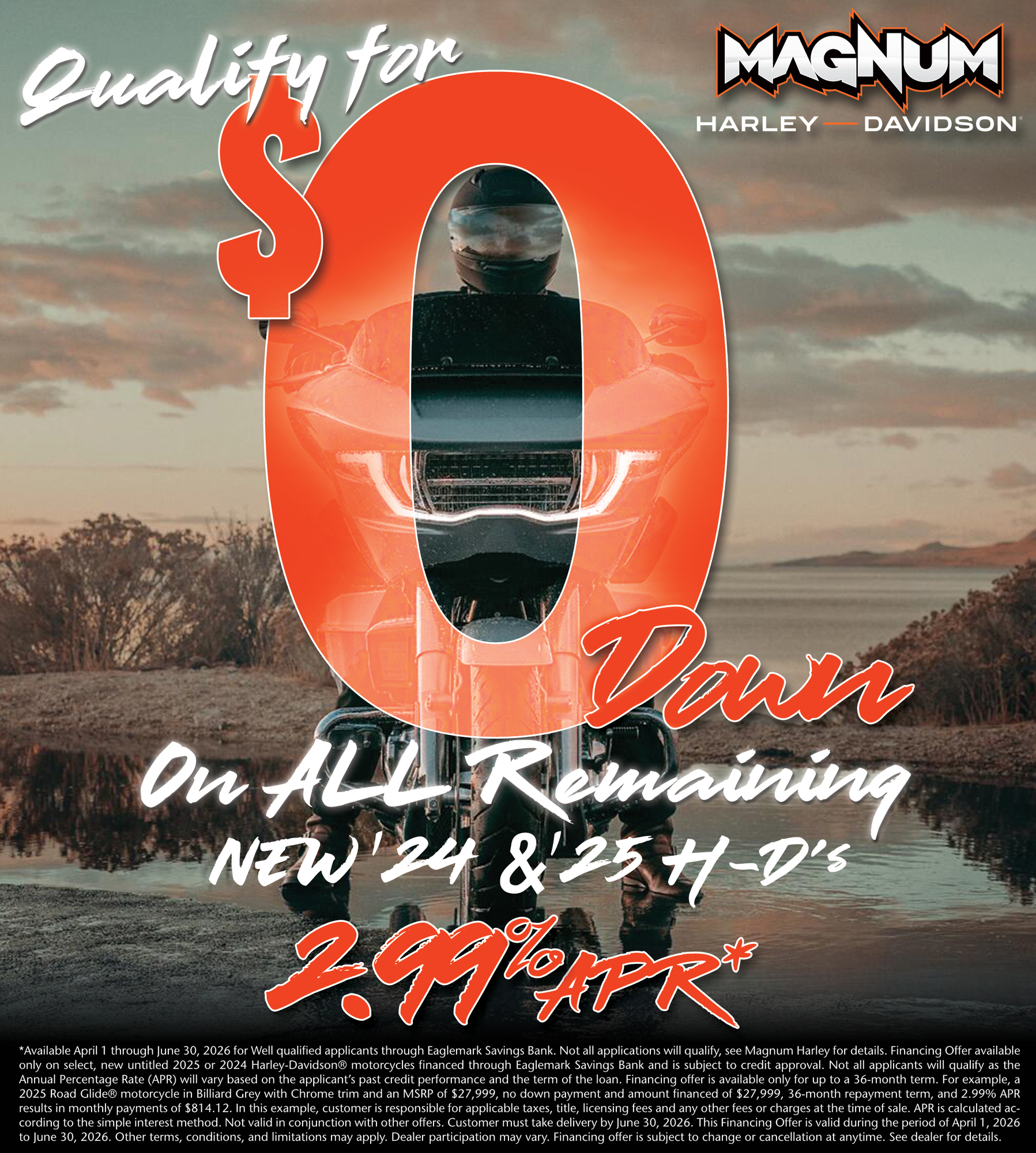 At Magnum Harley-Davidson®, we are powersports enthusiasts, and there's nothing we enjoy more than helping our customers find the kind of fun and adventure that a quality motorcycle can bring. If you're considering financing your new Harley-Davidson®, you're in good hands with our finance department. We are thrilled to get the opportunity to help you set up a financing plan that gets you out on the road and into the outdoors as soon as possible.